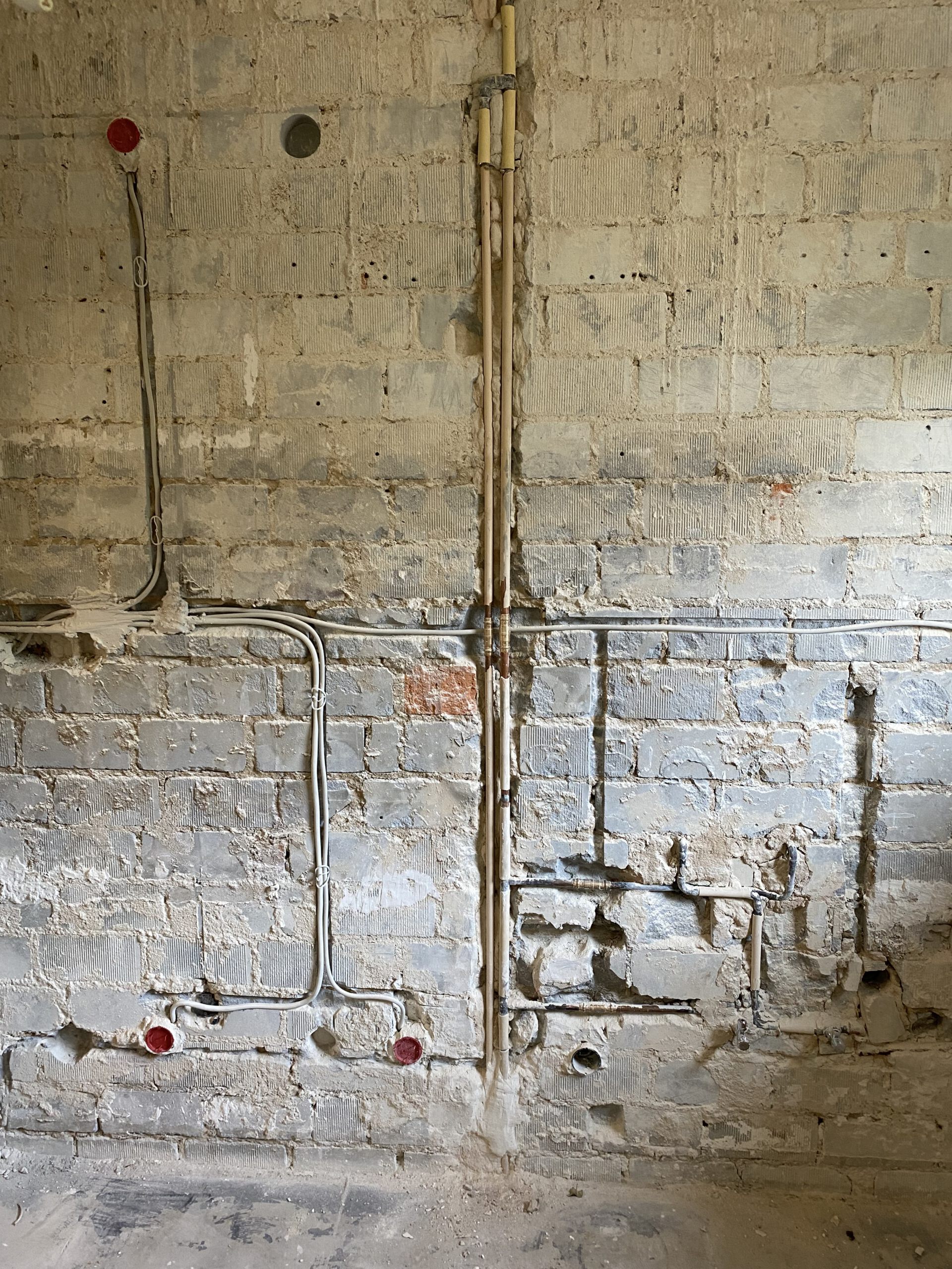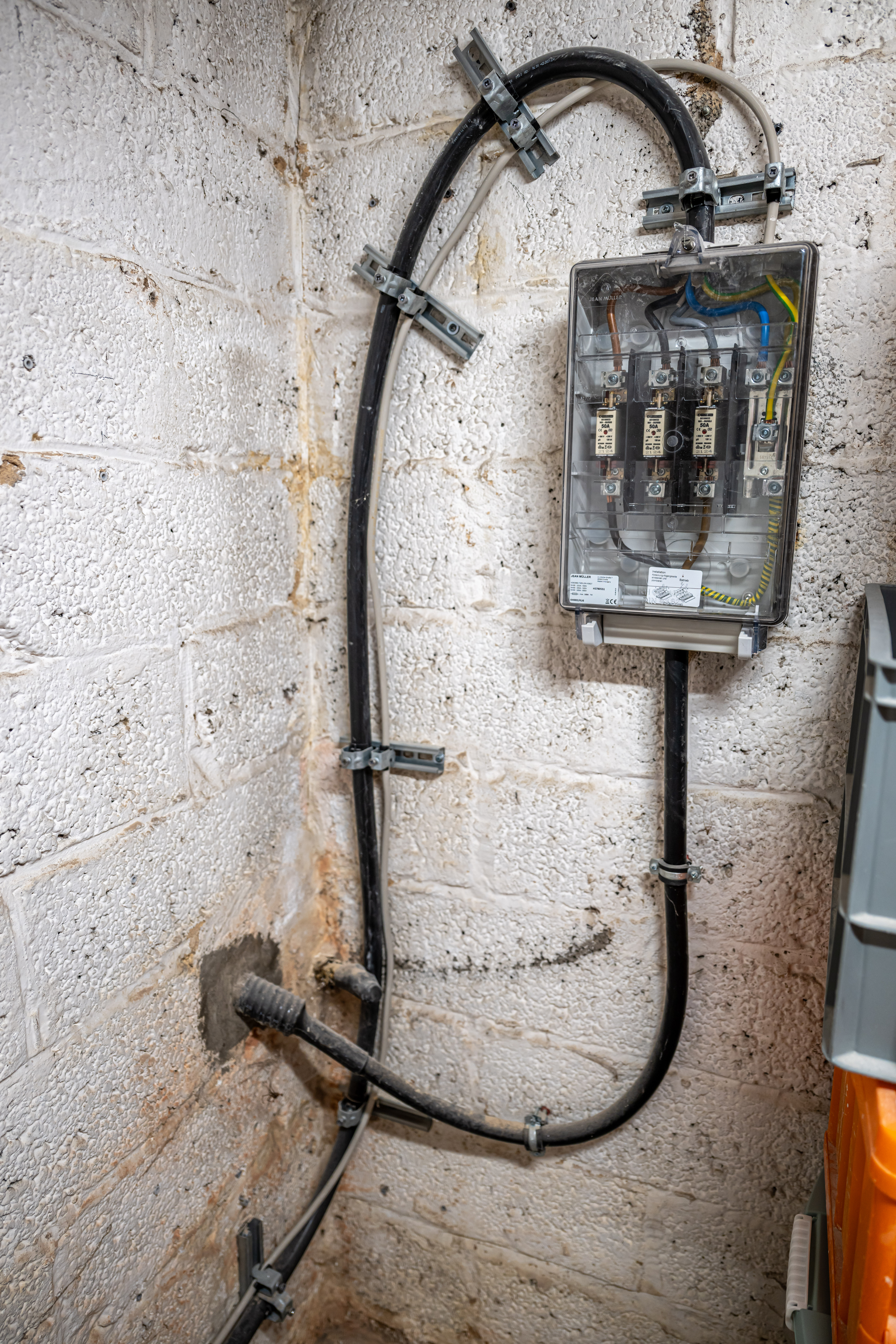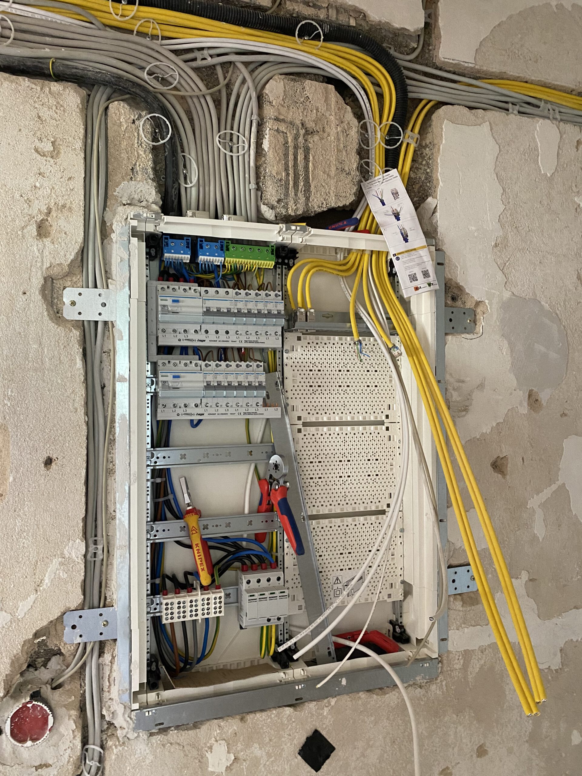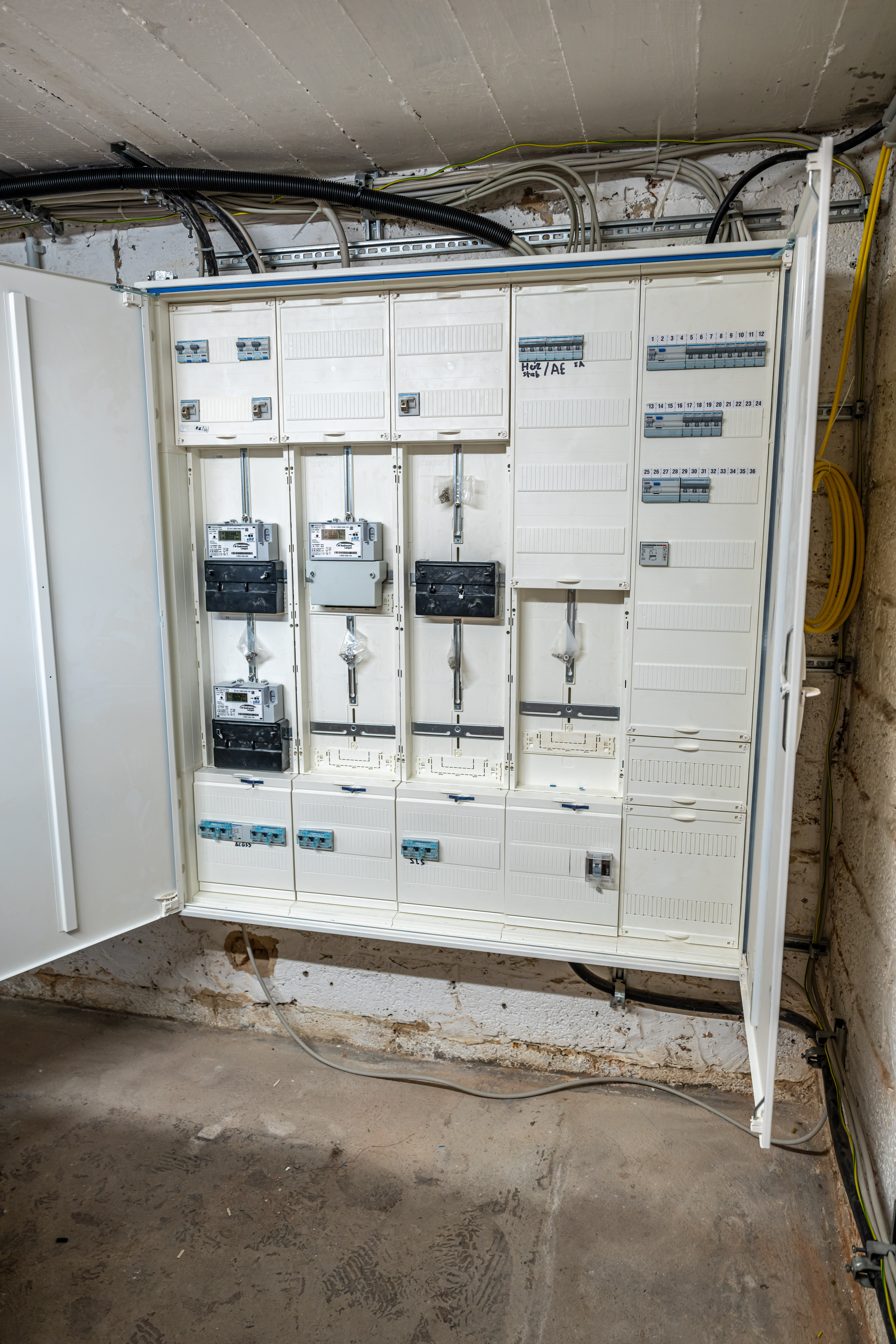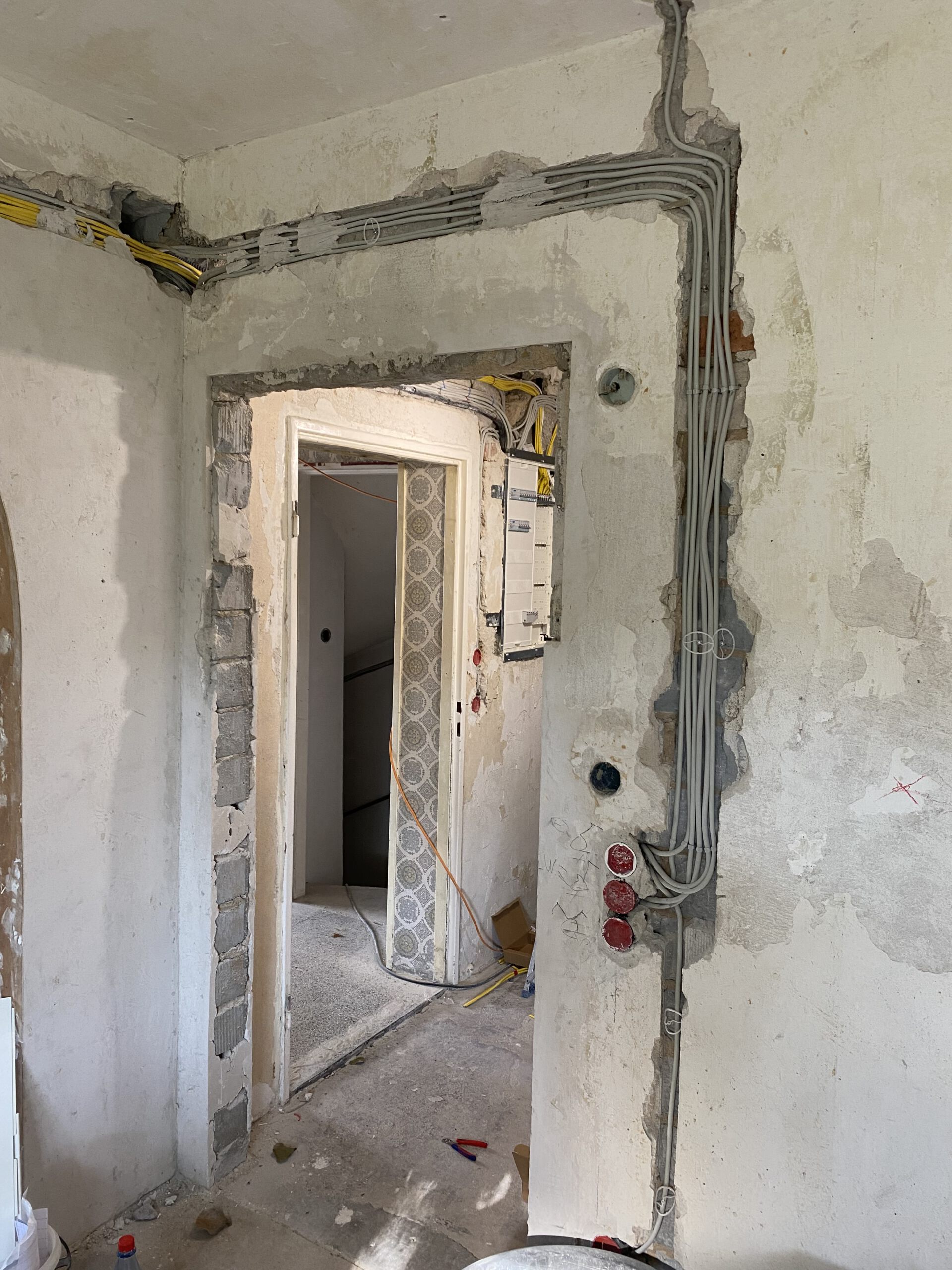 Sanierungszeitraum: August 2024 bis Mai 2025. Aufgaben: Inspektion der Altanlage, Analyse des Bedarfs, Sicherheitsbewertung und Erstellung eines Sanierungsplans, Rückbau der Altanlage. Haupt- und Unterverteiler installiert, Schalter und Steckdosen montiert